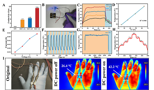圖5(A)DBT復合材料的電導率;(B)以藍色LED燈作為導電指示器演示DBT-334導電性能的實物圖;(C)DBT-334復合薄膜在不同施加電壓下的時間-溫度曲線;(D)DBT薄膜加熱過程中最高溫度與電壓平方(U2)之間的關系曲線;(E)DBT-334在不同電壓下的電流變化;(F)在7 V下的電-熱循環測試曲線;(G)DBT薄膜在7 V電壓下長時間通電過程中的表面溫度變化;(H)步進電壓切換過程中溫度的變化曲線;(I)DBT薄膜在5 V 輸入電壓下貼附于手部的實際加熱應用示意圖。
