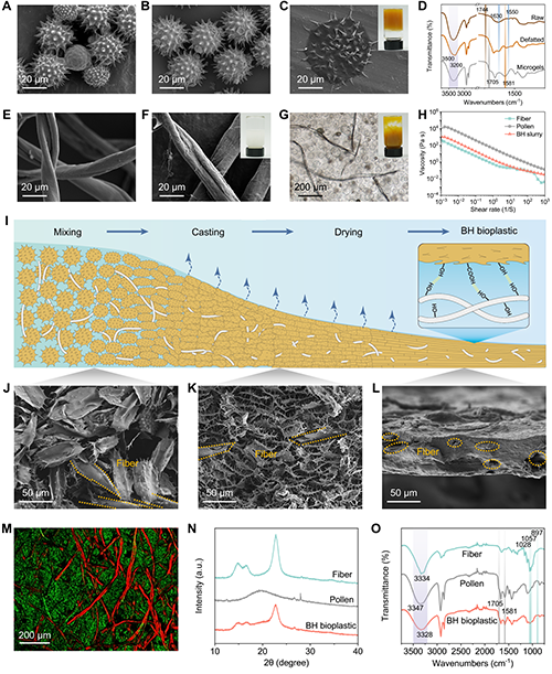 通過脫脂和熱堿處理對天然花粉進行改性,成功將其堅硬的外殼轉化為柔軟、中空且無致敏性的花粉微凝膠這一過程不僅使花粉顆粒因吸水膨脹而在高濃度下發生聚集,還賦予微凝膠優異的粘度和穩定性(圖2A-D)。同時,天然棉花經除雜和均質化處理后,形成均勻分散的纖維懸浮液(圖2E-F)。當兩者在稀釋狀態下混合時,可形成穩定的漿料,便于刮涂工藝實現規模化制備(圖2G-H)。