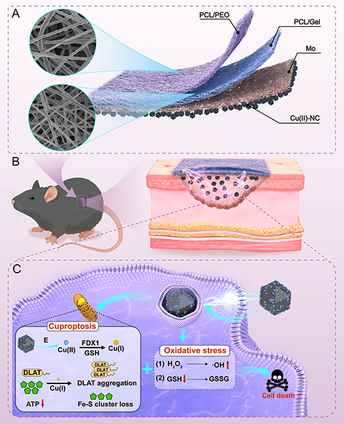 本項研究證實了Cu(II)-NC納米顆粒在電刺激協同下可顯著增強抗腫瘤療效,通過促進·OH的產生提高了細胞內的ROS水平,并引發線粒體膜電位下降,進而抑制三磷酸腺苷ATP的合成。在機制研究方面發現,經Cu(II)-NC+E處理后,可以誘導細胞DLAT蛋白聚集、FDX1表達下調。