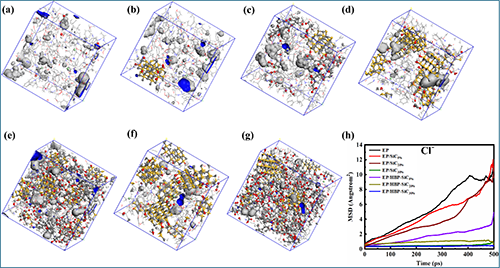 7 (a-g)Cl?探測EPEP/SiC5%EP/SiC20%EP/SiC30%EP/HBP-SiC5%EP/HBP-SiC20%EP/HBP-SiC30%涂層的自由體積分布;(h) Cl?在以上涂層中的MSD曲線