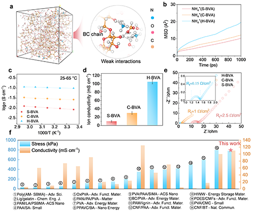 本工作通過熱引發(fā)聚合和鹽溶液浸泡法制備了具有高離子電導率和高機械性能的IBVA水凝膠電解質(zhì)。如圖1a、b所示,將BC膜浸沒在PVA/AA前驅(qū)體中,并進行常規(guī)凝膠化工藝以制備BVA水凝膠。在此過程中,BC鏈上暴露的羥基與PVA和PAA鏈上的羥基和羧基之間形成了大量的氫鍵(HBs),構(gòu)成了一個致密而有凝聚力的網(wǎng)絡(luò)(圖1c)。隨后,BVA內(nèi)多余的水分通過退火過程去除。最后,將制備好的BVA水凝膠浸泡在3 M甲酸銨溶液中重建聚合物網(wǎng)絡(luò),形成最終的IBVA水凝膠。由密度泛函理論計算(圖1d)可知,PAA?PAA和BC-PAA的結(jié)合能要高得多,證實它們之間存在大量的HBs。鹽浸過程后,甲酸陰離子與聚合物鏈的相互作用相對較弱,部分破壞了聚合物之間原有的HBs。這種作用有利于聚合物網(wǎng)絡(luò)的移動,進而有利于NH 4+的快速遷移,并有利于調(diào)節(jié)水凝膠的機械柔韌性。