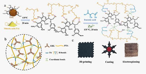 近期,廣東工業大學木質纖維素高值化利用團隊通過簡單的熔融分散-原位互鎖策略,構建了一種原料綠色、制備簡單、可多樣性加工,具備毫米級裂紋自愈能力和優異力學性能的全生物質彈性體(圖1)。該材料以酶解木質素(EHL)為剛性組分,熔融分散在硫辛酸(TA)中,并引入衣康酸(IA)與Zn2+實現原位共聚與動態配位交聯。所形成的雙網絡結構中,EHL在Zn2+協同下構建三維剛性骨架,并通過鏈纏結、氫鍵及金屬配位與柔性P(TA-IA)網絡互鎖(圖1)。所得材料不僅適用于澆筑成型、3D打印和靜電紡絲等多種加工方式,還展現出優異的結構調控潛力。該研究為可持續、高性能彈性體的綠色合成提供了新路徑,為木質素在高分子材料中的高值化利用開拓了新思路。
