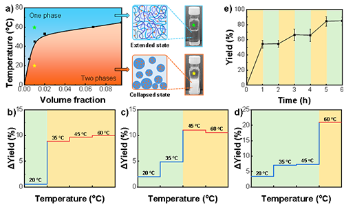 圖2. (a) 1,2,4-三唑鎓基PIL的相圖,(b-d)不同溫度下合成多孔有機籠的產率及升降溫循環催化實驗。黃色:T > UCST,綠色:T < UCST。