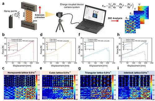為探究結構設計策略對材料宏觀力學性能的影響,研究團隊對四類不同晶格結構(蜂窩形、正方形、三角形、互鎖形)的TPR-SSE復合材料開展了準靜態拉伸實驗,并結合光學原位測量方法計算了拉伸過程中的應變場分布。在拉伸載荷條件下,由硬相晶格骨架主導復合材料的承載能力,其泊松比的差異顯著影響復合材料的應變分布和形貌演化。值得關注的是,具有較低正值泊松比的蜂窩結構可有效調節軟相SSE的局部應力集中,降低界面剝離與橫向壓縮失穩風險,從而顯著提升材料在準靜態條件下的整體力學性能。