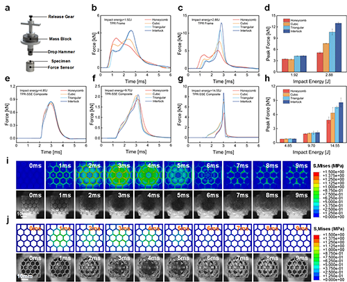 為進一步探究TPR-SSE復合材料的軟硬相晶格結構的力學增強機制,研究團隊構建了落錘沖擊測試平臺,并輔以光學原位測量與有限元仿真分析方法,系統表征了不同結構策略下復合材料的動態失效行為。在動態沖擊過程中,粘彈性軟相SSE憑借獨特的應變率強化效應耗散了大部分沖擊動能,而硬相晶格TPR骨架為復合材料提供了堅固的結構支撐并顯著抑制整體變形。軟硬相晶格結構設計策略有效地提升了復合材料在動態沖擊載荷下的失效閾值,顯著增強了其動態緩沖性能,其中蜂窩晶格結構展現出最優化的力學增強效果,彰顯了該類結構在動態沖擊防護應用中的工程潛力。