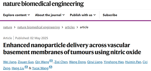 近日,中國科學技術大學王育才/蔣為團隊在《Nature Biomedical Engineering》在線發表題為《Enhanced nanoparticle delivery across vascular basement membranes of tumours using nitric oxide》的研究論文。本工作聚焦于納米顆粒在實體瘤跨血管轉運過程中的關鍵障礙—腫瘤血管基底膜(Basement Membrane, BM)屏障,提出利用一氧化氮(NO)實現基底膜屏障可控降解與重塑,從而提升納米顆粒在腫瘤組織內的遞送效率。