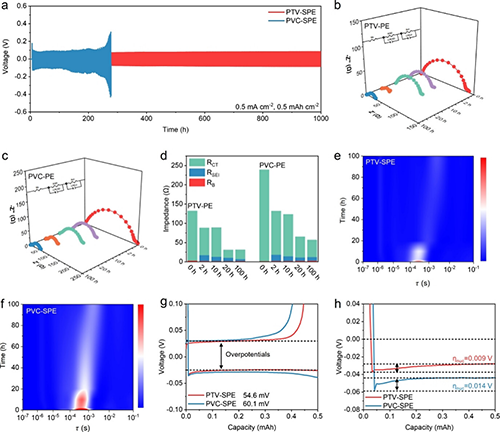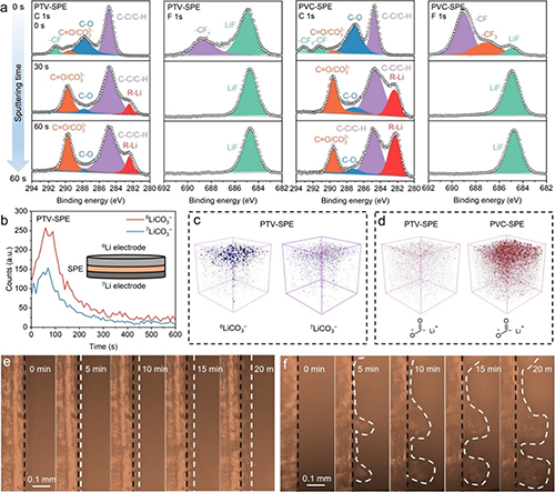 近期,武漢理工大學徐林教授團隊與新加坡國立大學Chaobin He教授團隊合作,通過氟代丙烯酸酯單體和碳酸亞乙烯酯(VC)單體的原位共聚設計,成功制備出具有優異界面穩定性和電化學性能的聚酯基電解質PTV-SPE。該聚合物電解質可通過原位側鏈錨定作用屏蔽并保護環狀碳酸酯結構上的酯基,有效抑制聚碳酸酯基電解質與鋰金屬負極的界面降解,從而提升固態電池的界面穩定性。此外,本研究首次結合TOF-SIMS、XPS和AIMD等方法,系統研究了聚碳酸亞乙烯酯基聚合物電解質在鋰金屬界面的降解路徑。相較于已有研究,該工作提出了提高聚碳酸酯基電解質穩定性的新策略,為聚合物基固態鋰金屬電池的發展提供了新思路。該工作以“Anchoring Side Chains to Carbonate Groups for Reviving Stable Polycarbonate-Based Solid-State Lithium Metal Batteries”為題發表在《Journal of the American Chemical Society》上。文章第一作者是Hantao Xu,Wei Deng,Jingyuan Yu。文章第一單位是武漢理工大學。該研究得到國家自然科學基金委的支持。