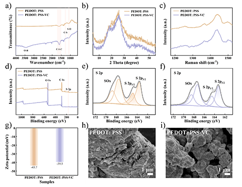 作者對VC二次摻雜前后的PEDOT: PSS進(jìn)行了結(jié)構(gòu)的分析和表征。FTIR光譜結(jié)果顯示VC摻雜后,除去了體系中部分不導(dǎo)電的PSS,有利于提高導(dǎo)電性。并且通過XRD譜圖說明PEDOT的結(jié)晶度的提高,通過Raman光譜分析VC摻雜后PEDOT的構(gòu)象變化,由于PSS的部分去除,PEDOT的構(gòu)象從螺旋線圈結(jié)構(gòu)(1433 cm-1)更多的轉(zhuǎn)變?yōu)榫性結(jié)構(gòu)(1426 cm-1),導(dǎo)致電荷在PEDOT鏈上更加離域。通過XPS圖譜和zeta電位圖,進(jìn)一步說明了體系中PSS的含量降低,VC二次摻雜后PSS的成功去除。通過SEM照片說明了VC二次摻雜后,PEDOT: PSS的團(tuán)聚現(xiàn)象得到了明顯的改善,整體形貌由從致密態(tài)轉(zhuǎn)變?yōu)槭杷蓱B(tài),引入含有豐富的親水性羥基官能團(tuán)的VC有效提高了體系分散性。