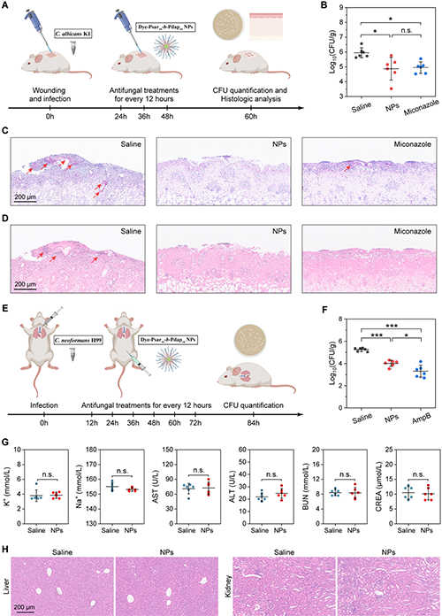 在皮膚擦傷感染模型中,NPs處理使感染皮膚的真菌負(fù)荷明顯降低,并顯著減少組織菌絲入侵和炎性細(xì)胞浸潤(rùn),與抗真菌藥物咪康唑療效相當(dāng)。肺部感染模型中,NPs和AmpB處理都能顯著減少感染器官的真菌負(fù)荷。值得注意的是,靜脈注射劑量高達(dá)120 mg/kg的NPs,小鼠的血清生化指標(biāo)和組織學(xué)分析均未觀察到肝腎毒性。這些結(jié)果表明Dye-Psar10-b-Pdap10 NPs兼具出色的體內(nèi)抗菌效果和生物安全性,具有治療耐藥真菌感染的巨大潛力。