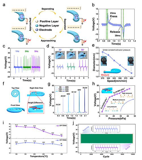 圖3a展示了同軸壓力摩擦電納米發電機傳感器(CP-TENG)的工作原理,CP-TENG無需外接電源即可對壓力的穩定傳感,展現了其獨特優勢。除此之外,利用同軸打印技術可定制化纖維的幾何形狀,圖3f展示了具有高度梯度的螺旋形CP-TENG,實驗證明,高度梯度的存在顯著提高了傳感器的靈敏度(圖3h)。CP-TENG在紫外光處理、酸堿溶液浸泡和高溫高濕環境中均保持一定的傳感能力,并在超10000次循環中保持穩定性能。