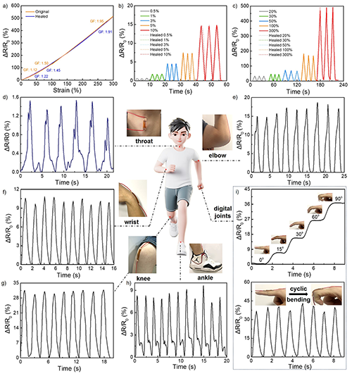 迄今為止,利用導(dǎo)電WPUs材料制造的柔性彈性皮膚狀電子器件在人機交互或健康監(jiān)測領(lǐng)域受到越來越多的關(guān)注,人們普遍通過選擇具有不揮發(fā)性和穩(wěn)定特性的離子液體(ILs)與普通WPUs共同構(gòu)建離子凝膠,以增加電子器件的導(dǎo)電性。因此,選擇離子液體1-丁基-3-甲基咪唑雙[(三氟甲基)磺酰]亞胺([BMIM]TFSI)與ASB/CHZ/PHMG@WPU2乳液混合以制備導(dǎo)電的離子凝膠。如圖6b、6c所示,離子凝膠ASB/CHZ/PHMG@WPU2-IL30(靈敏度1.95、電阻值3.51×105 Ω、電導(dǎo)率36.2 μS cm-1、抗拉強度2.11 MPa、斷裂伸長率430%)在大應(yīng)變、小應(yīng)變下均有穩(wěn)定傳感表現(xiàn),可以滿足離子皮膚的需要。將傳感器緊貼在人體的某個關(guān)節(jié)上,以記錄運動與時間相關(guān)的電阻變化(ΔR/R0信號)。如圖6d-i所示,離子凝膠在咽喉(圖6d)、肘部(圖6e)、手腕(圖6f)、膝蓋(圖6g)和腳踝(圖6h)的運動都出現(xiàn)了穩(wěn)定而靈敏的?R/R0信號,證明其不僅能監(jiān)測咽喉的微小運動,還能監(jiān)測手臂、腿部和腳部關(guān)節(jié)的劇烈運動,再次證實了其作為離子皮膚傳感器的潛力。