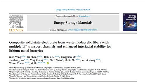 相關(guān)工作以“Composite solid-state electrolyte from waste modacrylic fibers with multiple Li+ transport channels and enhanced interfacial stability for lithium metal batteries”為題發(fā)表在國際著名期刊Energy Storage Materials 上(影響因子18.9),doi: 10.1016/j.ensm.2025.104294。本文第一作者為浙江理工大學(xué)紡織科學(xué)與工程學(xué)院(國際絲綢學(xué)院)碩士研究生楊宵,通訊作者為浙江理工大學(xué)博士生導(dǎo)師胡毅教授。