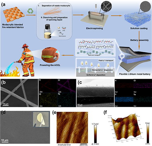 Fig. 1. Schematic diagram of the preparation process and characterization of waste modacrylic-derived electrolyte. (a) Diagrammatic representation of the recycling process converting waste modacrylic into composite solid electrolytes. (b) EDS mapping of modacrylic-LLZTO nanofibers. (c) Cross-sectional EDS mapping of the MLPN CSE. (d) SEM image of the surface and optical images (inset) of the ML-PN CSE. (e) AFM images (1 μm × 1 μm scan size) of ML-PN CSE with height sensor 3D imaging. (f) Peak force error.