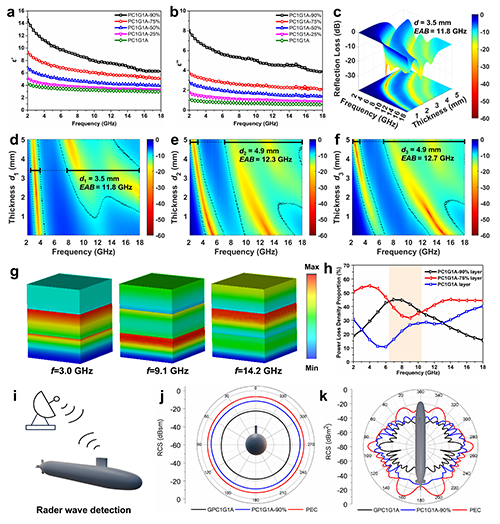 壓縮應變可以調控氣凝膠的介電常數,PC1G1A-90%的實部(ε'''')與虛部(ε'''''''')值最高,增強了電磁損耗。三層梯度結構GPCGA(PC1G1A/PC1G1A-75%/PC1G1A-90%)在厚度為11.9 mm時對應的有效吸收帶寬達到12.7 GHz(2.0~3.0和6.3~18.0 GHz)。CST模擬顯示,GPCGA涂層使潛艇模型的雷達散射截面(RCS)最低達到?52 dBsm,隱身性能優于單層PCGA。