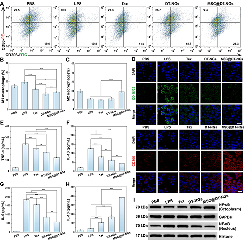 圖4、(A)流式細胞術分析不同處理后LPS激活的MH-S細胞中CD86和CD206的表達水平。不同處理后(B)CD86陽性巨噬細胞(M1)和(C)CD206陽性巨噬細胞(M2)的百分比。(D)不同處理后,LPS激活的MH-S細胞中CD16/32和CD206的免疫熒光染色。(I)WB分析不同處理24 h后LPS激活的MH-S細胞中NF-κB的表達水平。