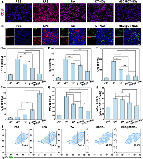 圖6、(A)不同處理后ALI小鼠肺組織的ROS染色。(B)不同處理后ALI小鼠肺組織巨噬細胞極化的免疫熒光染色。(C-F)不同處理后ALI小鼠肺泡灌洗液(BALF)中促炎細胞因子(TNF-α、IL-6和IL-1β)和抗炎細胞因子IL-10的表達水平。(G)不同處理后ALI小鼠BALF中中性粒細胞生物標志物MPO的表達水平。(H)ALI小鼠經不同材料處理24 小時后肺組織中中性粒細胞的百分比。(I)ALI小鼠經不同處理后肺組織中中性粒細胞的代表性流式細胞分析結果。