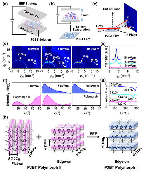 圖1. (a,b) 外加電場示意圖。(c)2D-GIWAXS示意圖。(d-f) 不同電場強度下P3BT薄膜的2D-GIWAXS圖、1D-GIWAXS圖以及極圖。(g)不同電場強度下P3BT薄膜的 DSC曲線。(h) P3BT薄膜晶型結構及結晶取向轉變的鏈堆積示意圖。
