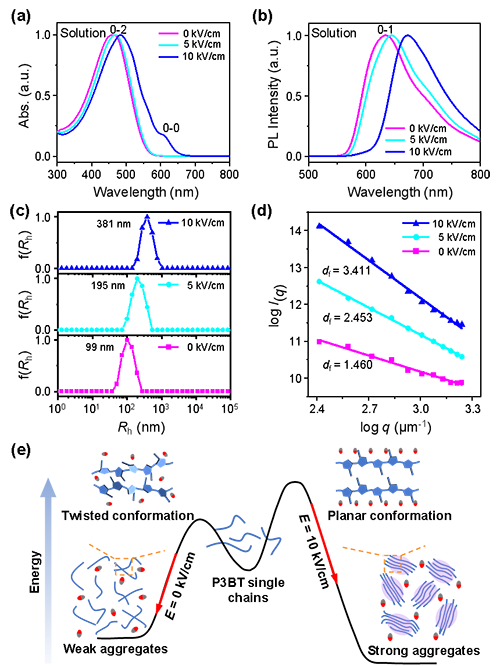 圖3. (a,b)不同電場強度下P3BT溶液的紫外-可見吸收光譜和熒光光譜。(c)不同電場強度下P3BT溶液的流體力學半徑分布。(d) 不同電場強度下P3BT溶液的log I(q)與log q關系,聚集體的分形維數(shù)(df)由log I(q)與log q線性擬合后的斜率獲得。(e) P3BT在溶液中不同狀態(tài)下的鏈構象和聚集結構示意圖。