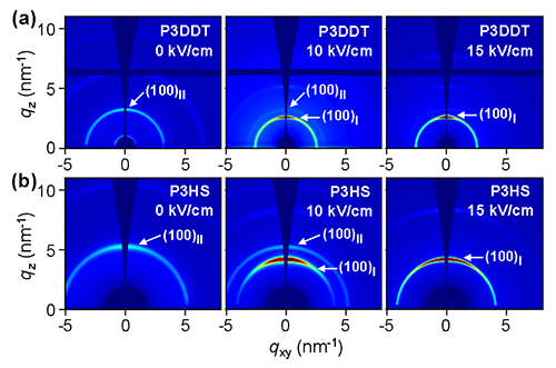 圖4. (a,b) 不同電場強度下聚(3-十二烷基噻吩)和聚(3-己基硒吩)的2D-GIWAXS圖。