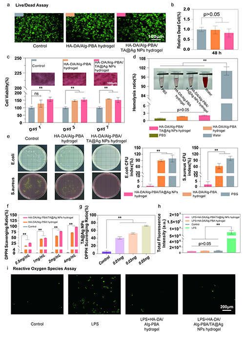 圖3.水凝膠的生物相容性、抗菌和抗氧化能力測試。(a) 48 小時的活/死評估照片記錄;(b) 48 小時活/死測試的統計分析;(c) 第 1 、 3 和 7 天的 CCK-8 分析結果;(d) 水凝膠的溶血行為;(e) 細菌鋪板和定量統計結果;(f) 水凝膠的 DPPH 清除結果;(g) TA@Ag NP 的 DPPH 清除結果;(h) ROS 的熒光定量統計;(i) 活性氧測定圖像 (*p<0.05,** p<0.01,n=3)。