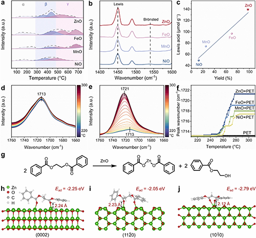 通過NH3-TPD和Py-IR分析(圖3a和圖3b)可知,TPA產率與催化劑的Lewis酸強度呈顯著正相關性(圖3c)。結果表明,ZnO因其最高的Lewis酸量,能夠更有效地從PET羰基中奪取電子,從而為后續羰基活化和β-斷裂創造了有利條件。原位傅里葉變換紅外光譜顯示(圖3e),PET和ZnO混合物中酯鍵的羰基發生藍移,這表明PET的酯鍵和ZnO之間產生強烈的化學相互作用。該現象源于ZnO隨溫度升高增強的吸附活化能力導致羰基極性降低、力常數增大。同時,ZnO的Lewis酸奪取羰基電子使β-H酸性增強,從而促進PET發生β-斷裂。正如預期的那樣,TPA產率與催化劑導致的PET酯鍵羰基藍移幅度呈現正相關,證明ZnO的吸附活化能力最強(圖3f)。