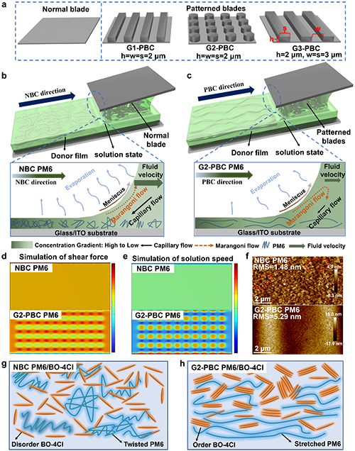 Figure 1. a) Structural schematics and parameters of normal blade and patterned blade with different micropatterns. b, c) Summary of solution flow direction (from solution state to the final film formation), flow and evaporation rate, and molecular stacking, d, e) simulation of shear force and solution speed, f) AFM images of NBC and G2-PBC PM6 films. g, h) Schematic diagram of PM6 chains arrangement and BO-4Cl molecules stacking of NBC and G2-PBC PM6/BO-4Cl films.