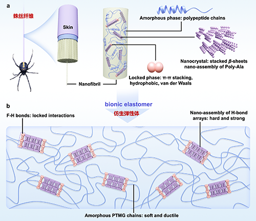 【圖1:天然蛛絲纖維及仿生彈性體的結(jié)構(gòu)】
