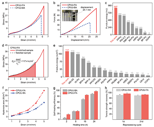得益于更小且更密集的氫鍵納米相,和對照材料CPUU-BA相比,CPUU-FA具有更優(yōu)異的彈性、高拉伸強(qiáng)度(42.3 MPa)和高韌性(55.6 MJ m-3),同時(shí)保持了低模量(7.1 MPa vs. 6.7 MPa),表現(xiàn)出軟而強(qiáng)韌的特性。CPUU-FA的抗穿刺能為887.0 mJ,是目前所有已報(bào)道彈性體中的最高值。它的抗撕裂能為117.4 kJ m?2,是天然橡膠斷裂能的11倍。此外,納米域是由動(dòng)態(tài)的氫鍵陣列和酚-氨酯鍵構(gòu)成的,其交聯(lián)具有可逆性,這一特征使彈性體表現(xiàn)出突出的修復(fù)效率(98.0 %)、熱穩(wěn)定性和良好的再加工性。
