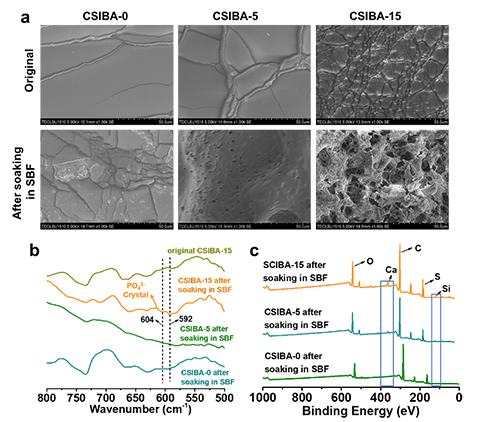 圖2. (a)不同組成黏合劑浸泡模擬體液后的SEM圖片;(b)不同組成黏合劑浸泡模擬體液后的紅外光譜圖;(c)不同組成黏合劑浸泡模擬體液后的XPS結果