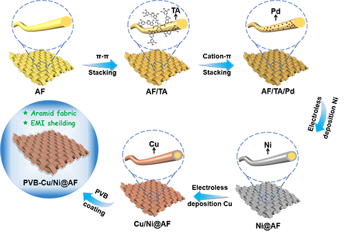 在 5G 及 6G 通信技術高速發展的背景下,電磁污染問題日益凸顯,對高性能電磁干擾(EMI)屏蔽材料的需求愈發迫切。理想的屏蔽材料需兼具輕質、柔性、高導電性、卓越機械性能以及可靠的環境穩定性。芳綸(聚對苯二甲酰對苯二胺)纖維增強復合材料憑借其出色的比強度和耐熱性,已廣泛應用于航空航天電子領域,并展現出實現高效 EMI 屏蔽的需求。然而,芳綸纖維固有的化學惰性導致其在 EMI 屏蔽涂層與纖維基體間難以形成牢固的界面結合力,嚴重制約了其實際應用。傳統的化學蝕刻方法雖可在高分子纖維表面引入活性位點以促進金屬顆粒附著,但往往不可逆地損害纖維的固有機械強度。為突破這一瓶頸,本研究引入了一種非破壞性的π-π 共軛表面修飾策略。該技術在不損傷纖維本體結構的前提下,于惰性纖維表面高效構筑活性位點,進而實現了均勻、可控的金屬涂層沉積。