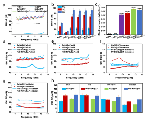 圖5 (a) EMI SE, (b)平均SER, SEA和SET, (c) Ni@AF, Cu@AF, Cu/Ni@AF, Ni/Cu@AF, PVB-Cu/Ni@AF和PVB-Ni/Cu@AF織物的電導率,(d)堿性,(e)酸,(f)氧化和(g)浸泡處理的典型樣品的EMI SE,(h)典型樣品的平均SET.