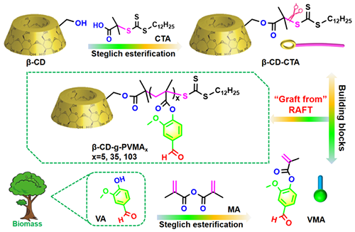細菌在公共衛生領域的泛濫、真菌在農業領域的危害,已嚴重影響了人類的日常生產和生活。已開發了可抑制微生物感染的不同形貌納米材料,但實現材料的精確合成與組裝仍然是一項巨大的挑戰。西北師范大學王榮民教授團隊等創新性地提出了一種新穎的聯合策略:通過“Graft from”RAFT介導的超分子主客體原位自組裝構建了納米環,可以最大限度地提升香草醛的抗微生物性能(圖1)。在聚合過程中,線性均聚物鏈的合成和原位自組裝同時實現,這為“graft from”RAFT介導的超分子主客體原位自組裝提供了新的見解。