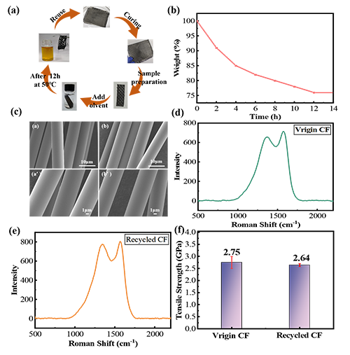 圖2. (a) PHDF/CF在0.1 M HCL水/Ace (2/8, v/v)中降解示意圖;(b) cf增強復合材料失重圖;(c)原碳纖維(a-a′)和再生碳纖維(b-b′)的SEM圖像;(d)(e)原碳纖維和回收碳纖維的拉曼光譜;(f)原碳纖維和再生碳纖維的單絲拉伸強度和斷裂伸長率