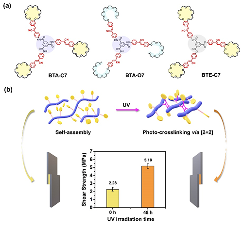 圖1. (a)分子結構式;(b)協同超分子-共價聚合策略實現顯著黏附性能的示意圖。
