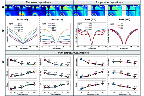 圖3. 不同厚度和溫度下P3PT薄膜的2D GIWAXS圖(a),取向結構分析(b)以及相應的結構參數(c)。