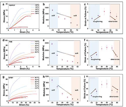 圖4. FAST方法測試的PDPP3T(a-c), PM6(d-f)和IDTBT(g-i)的應力-應變曲線、模量和斷裂應變隨溫度的變化規律。