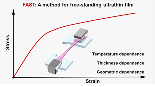 圖1. (a) 高分子材料力學測試方法的示意圖,展示了測試對象從傳統塊體材料向微米/納米級超薄膜的示意圖。(b) FAST方法示意圖。圖中展示了自支撐聚合物超薄膜的制備流程,包括基底旋涂、界面釋放、薄膜轉移與邊緣固定等關鍵步驟;同時展示了基于該方法的無基底拉伸測試原理,有效避免了應力耦合干擾,實現對高分子超薄膜本征力學行為的精準表征。