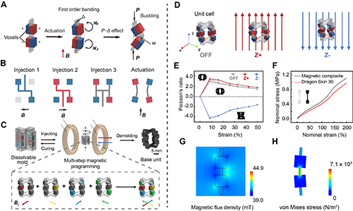 研究團隊設計了一種基礎單元,通過流體控制技術實現單元內部磁化體素的精細調控。各個體素在磁場作用下產生精確可控的彎曲變形,通過特定磁化模式,可使結構在不同磁場條件下表現出磁響應變形引導的壓彎屈曲,宏觀上展現出可切換的正、負泊松比,實現了材料力學性能的靈活調控能力。