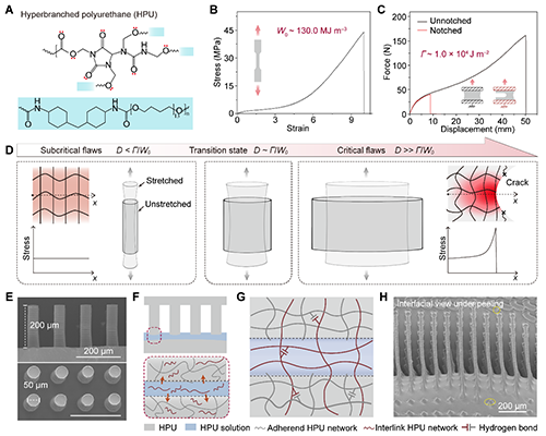 研究團隊首先通過材料設(shè)計,合成了具有優(yōu)異力學性能的HPU彈性體。這種材料因其分子結(jié)構(gòu)中特有的氫鍵作用,表現(xiàn)出高強度(約44 MPa)和高延伸性(約1000%)。研究發(fā)現(xiàn),HPU的缺陷敏感尺度約為77 μm,當微結(jié)構(gòu)尺寸小于這一閾值時,材料表現(xiàn)出明顯的尺寸效應——即隨著微柱直徑的減小,其韌性顯著提升。研究人員采用3D打印與模板復制技術(shù)制備了一系列直徑從50 μm至800 μm、高度200 μm的HPU微柱陣列,并通過溶劑溶脹粘接構(gòu)建了不同直徑的HPU微柱粘接界面。