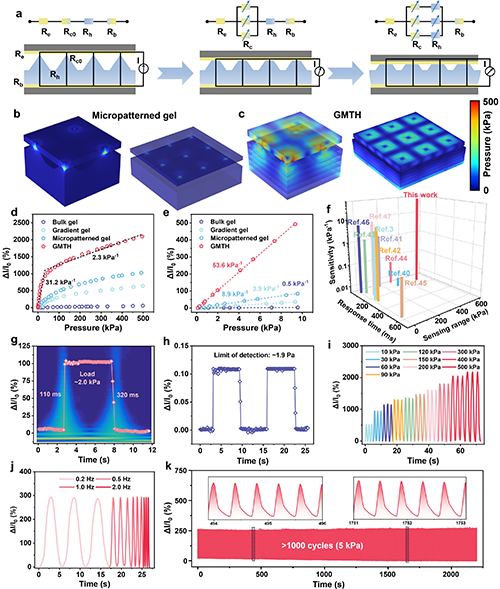 圖3. 熱電凝膠主動壓阻敏感機制和性能