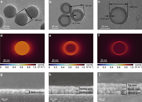 圖3. (a) 底層的實心二氧化硅納米顆粒以及 (b) 中間層和(c) 頂層的空心二氧化硅納米顆粒的透射電鏡圖像。(d-e) 上述二氧化硅納米顆粒對應的電廠密度分布圖。沉積了 (g) 底層、(h)底層和中間層以及 (i) 底層和中間層和頂層二氧化硅納米顆粒的掃描電鏡界面圖像。