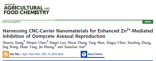 植物卵菌是農業領域極具破壞性的病原體,能引發多種嚴重植物病害,導致作物大面積枯萎和產量銳減。例如,馬鈴薯晚疫病的爆發曾引發19世紀愛爾蘭大饑荒,造成廣泛的糧食危機,充分暴露了卵菌對農業生產和全球糧食安全的重大威脅。目前,植物卵菌的防治主要依賴化學農藥,但長期使用容易導致病原產生耐藥性,降低防控效果。近年來研究表明,孢子是卵菌傳播和感染的關鍵來源,抑制其無性繁殖過程,尤其是孢子囊的形成與孢子的釋放,對于有效防控病害至關重要。近些年來,Zn2+被報道具備抑制卵菌繁殖的潛力。基于此,孫現超教授與黃進教授系統研究了CNC@PDA@Zn2+對辣椒疫霉無性繁殖的抑制作用及其分子機制,相關結果以題為“Harnessing CNC-Carrier Nanomaterials for Enhanced Zn2+-Mediated Inhibition of Oomycete Asexual Reproduction”發表在農林科學TOP期刊《Journal of Agricultural and Food Chemistry》。