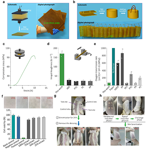 通過網絡結構的設計,在顯著提升纖維素紙力學性能的同時,材料的熱穩定性和耐水耐溶劑性也得到改善。由于紙張固有的熱穩定性,改性后的纖維素紙塑材料表現出優于傳統商業塑料的熱穩定性,在150 ℃下放置半小時后仍能保持尺寸的穩定。纖維素紙塑材料通過引入的非異氰酸酯聚氨酯網絡,阻止了親水纖維素鏈段吸水,從而在水中浸泡1周后,仍能保持80MPa以上的力學強度;在多種有機溶劑中浸泡后,也未發生顯著的溶解和溶脹現象,顯示了優秀的耐水耐溶劑性。通過該策略對不同類型紙張進行改性制備紙塑材料,同時批量制備為紙板、紙袋、紙吸管等產品,作為產品展示出優秀的氣體阻隔性能、生物相容性、熱封性能、印染能力等,顯示出制備工藝的簡便普適性以及作為產品應用的潛力。另外,纖維素紙塑材料能夠生物降解,且通過材料網絡結構的動態性,其即可化學降解回收也可物理熱壓再生,具有環境友好性。