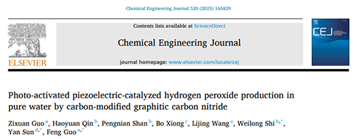 文章信息:Z. Guo, H. Qin, P. Shan, B. Xiong, L. Wang, W. Shi,* Y. Sun,* F. Guo,* Photo-activated piezoelectric-catalyzed hydrogen peroxide production in pure water by carbon-modified graphitic carbon nitride, Chemical Engineering Journal 520 (2025) 165829.