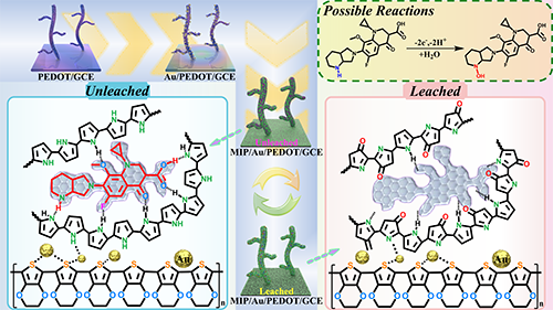 隨著人類生產(chǎn)生活質(zhì)量的提高,氟喹諾酮類(FQs)抗生素引發(fā)的潛在環(huán)境污染被人們所關(guān)注。因其在生物體內(nèi)難以完全被吸收,未被代謝的部分則將會排入環(huán)境中,跟隨生物鏈最終富集在人體內(nèi)。因此,對環(huán)境中痕量濃度的FQs抗生素的靈敏傳感是十分必要的。分子印跡電化學(xué)傳感器(MIP/ECS)因其方便小型化、易于改性修飾,是在眾多類型的傳感器中極具潛力的一類。隨著分子印跡技術(shù)在傳感器中的應(yīng)用,為實現(xiàn)更加精準的探測提供可行方案。聚(3, 4-乙烯二氧噻吩)(PEDOT)類導(dǎo)電聚合物具有較好的電化學(xué)活性和生物相容性,在特定的條件下可以合成出具有一定微觀形貌的聚合物,能夠為傳感器提供更大的比表面積,以支持更多印跡空腔。本文匯總了新疆大學(xué)吐爾遜·阿不都熱依木教授課題組PEDOT類導(dǎo)電聚合物分子印跡電化學(xué)傳感器領(lǐng)域研究進展。主要研究內(nèi)容和結(jié)論如下