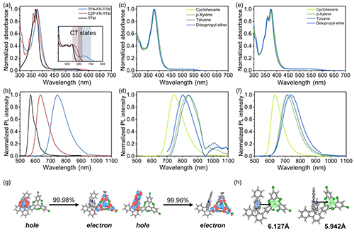 圖3:TPA-FR-TTM和CZP-FR-TTM的光物理性質(zhì),自然躍遷軌道計算結(jié)果及質(zhì)心距離。