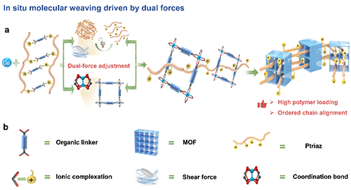 圖1 雙重作用力引發的分子編織構筑離子型聚合物–MOFs復合材料