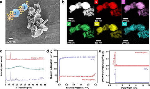 圖2系統展示了MW-Ptriaz@MOFA的SEM/TEM形貌、元素分布、XRD譜圖以及比表面積和孔徑分布等表征結果,證明陽離子聚合物鏈已成功限域于MOFs納米孔道中,同時材料的結晶性依然得以保持。