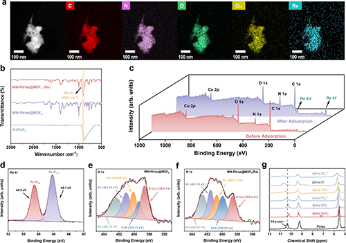 圖4展示了MW-Ptriaz@MOFC在吸附ReO4ˉ后的TEM形貌、元素分布、紅外光譜、X射線光電子能譜以及1H NMR譜圖。結果表明,吸附過程不僅涉及陽離子聚合物與ReO4ˉ之間的靜電相互作用,還包括陽離子聚合物中1,2,4-三氮唑鎓C5–H與ReO4ˉ之間的路易斯酸–堿對作用。