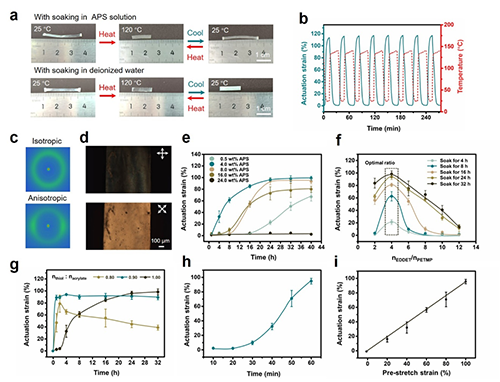 材料在單軸預(yù)拉伸后可實(shí)現(xiàn)接近110%的可逆驅(qū)動(dòng)應(yīng)變,并在高達(dá)140 ℃的環(huán)境下仍保持穩(wěn)定性能。與動(dòng)態(tài)化學(xué)鍵固定法相比,該方法的熱穩(wěn)定性明顯提升。團(tuán)隊(duì)還優(yōu)化了材料配方和浸泡條件,確定了最佳APS濃度、交聯(lián)劑比例及丙烯酸基團(tuán)含量,使驅(qū)動(dòng)應(yīng)變與編程效率達(dá)到平衡。